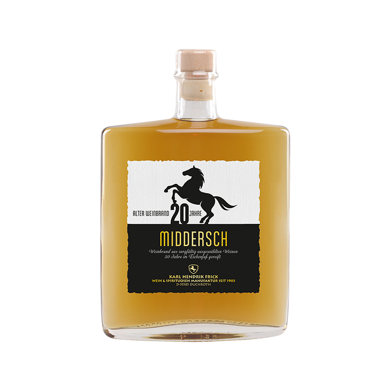 Die Familie Frick, ist Namensgeber dieses feinen Weinbrands. In dem kleinen Örtchen Duchroth, in der Weinregion Nahe, werden die Fricks „Middersch“ genannt. Einer Ihrer Vorfahren, Georg Frick handelte, neben dem Weinbau, mit Fasswein. Er war somit Wein-Komissionär oder „Vermittler“, woraus die Dorfbewohner dann „Middersch“ machten.