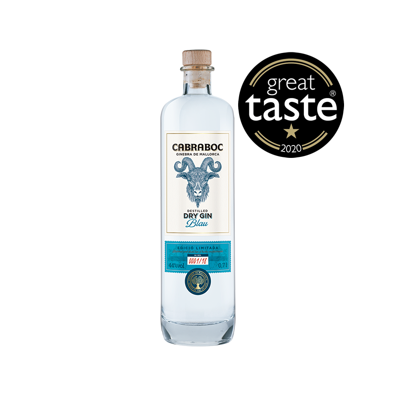 Cabraboc Dry Gin Blau. Ein mediterraner Dry Gin aus Mallorca, auf Basis ausgewählter Getreidealkohole und bester Wacholderbeeren hergestellt, mit mediterranen Kräutern wie Basilikum, Rosmarin, Thymian und Lavendel abgestimmt. Alle Zutaten werden einzeln destilliert.